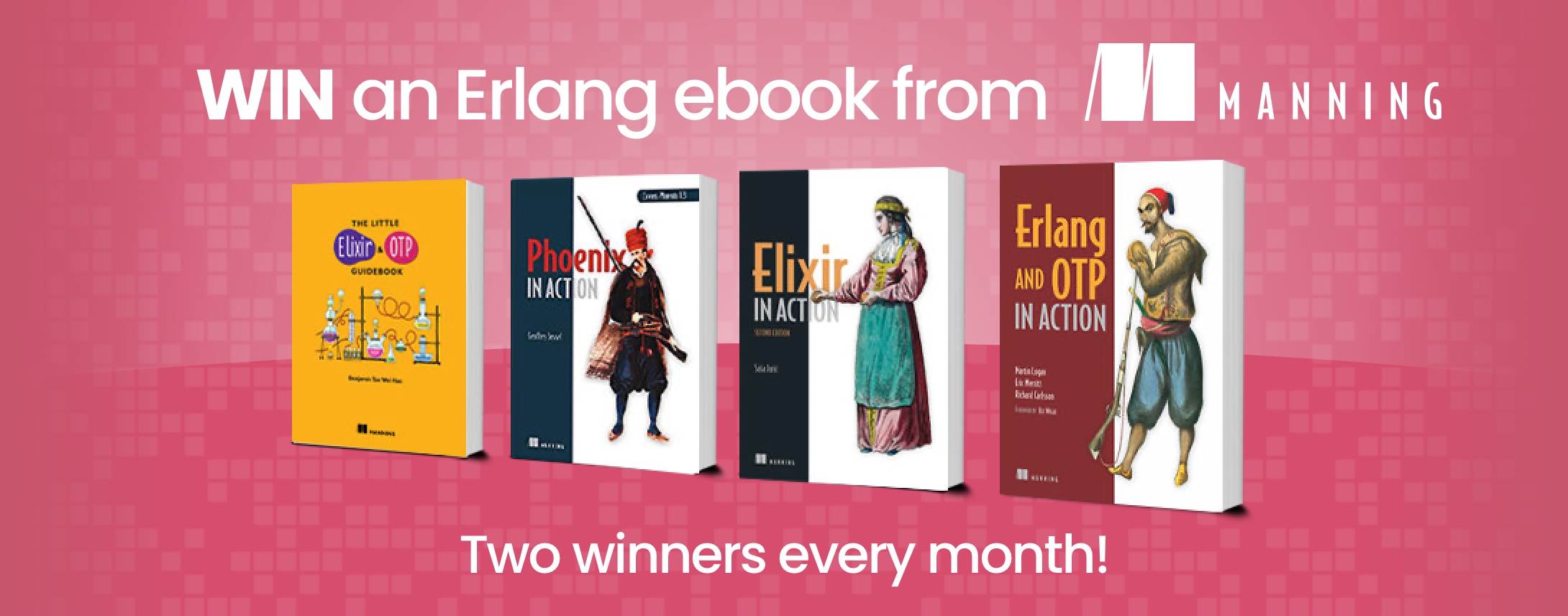 We've teamed up with our friends at Manning Publications to give you the chance to win one of their Erlang or Elixir ebooks. Not only that, we have two to give away every month until the end of 2025 - that's two Erlang Forums winners each month!